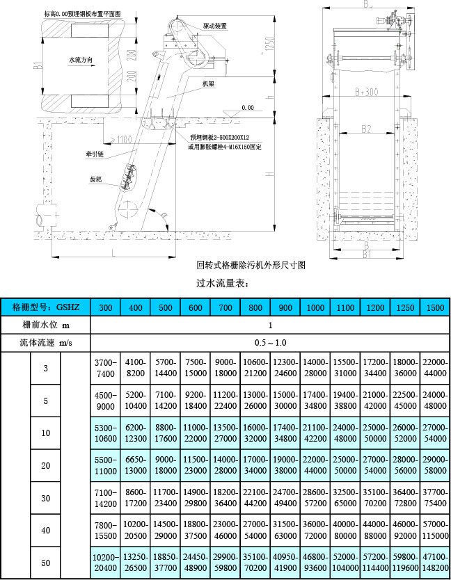 按设备宽W0 格栅机分:单联机GSHZ300-1400 型、并联机GSHZ1400-3000 型。选型由过水量、提升高度而定,同时根据所分离杂物的大小选配不同格栅。