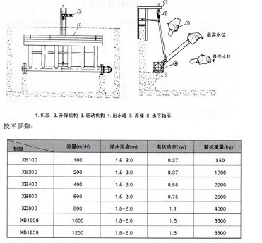 旋转式滗水器由电机、减速机组成的驱动装置;蜗轮、蜗杆、丝杠组成的升降装置;四连杆机构、排水支管和总管、出水堰槽、浮筒及排渣装置、水下轴承等组成。旋转式滗水器通过驱动装置和四连杆机构将丝杠的直线升、降运动转换成出水堰及排水管的旋转运动,以滗除上清液。浮筒排渣装置在堰口前方的水上、水下和两侧形成一个无浮渣的出水区域,浮筒漂浮于水面可以自动调节与堰口之间的距离。驱动机构采用高品质电机和减速机,也可采用原装进口精密伺服马达和驱动装置。升降机