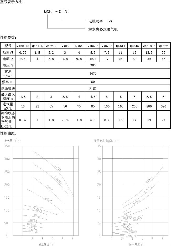 QXB 型离心式潜水曝气机为直联式结构。旋转的叶轮在水中产生一个离心力,通过离心力在叶轮周围形成一个负压区,空气通过进气管被吸入,被吸入的空气和水在混合盘内混合,随后这种良好的均匀的混合物自动从排出口排出。