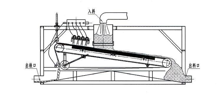 矿浆通过入料管道进入本磁选机的均匀补料装置,经过充分分散后被均匀的洒落在磁板上部的卸铁皮带上,在重力作用下浆料沿磁板的倾斜方向向下流动,浆料中含有的铁磁性物在磁棒提供的强磁场下,被牢牢的吸附在卸铁皮带上,电机转动装置驱动卸铁皮带沿磁板倾斜方向向上运动,同时将吸附的铁磁性物带入卸铁区域,被卸铁水管冲洗水冲入尾矿斗中被集中收集,无磁性浆料继续沿磁板向下流动,流入精矿斗中被集中收集。