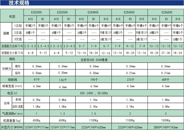 EZS系列是佐竹公司利用全彩色CCD相机研制出的高性能色选机。利用全彩色相机,可以更好的分辨出单色色选机无法识别的相近色彩,如大米中的淡水黄、心白等,大大提高了色选机的选别性能。特别是佐竹公司研发的独特的感度处理系统对海量数据进行高效地处理 使客户操作非常便捷。 ◆全彩色色选技术 相近的颜色在单色相机下无法分辨,在传统的双色面坐标系中存在的色彩重叠很难彻底分开,而在全彩色的三轴空间坐标系中,利用佐竹独特的坐标系转轴技术找到相近颜色的**分离面,可以彻底将相近的颜色分开,达到**的色选效果。 ◆长寿命LED光源 采用长寿命的LED光源,寿命是荧光灯的10倍。 ◆超耐久高速喷射阀 高精度的喷射阀提供高达50亿次的超长寿命,可以在机器的整个生命周期免更换。 ◆先进的感度处理技术 客户可以根据需要通过投入不良样品来自定义希望剔除的物体。软件会自动生成感度。 ◆简便的独立感度系统 选病斑、选淡水黄、选深黄、选腹白…客户可以根据需要调整感度,每种感度独立存在,独立调整,十分方便和简单。 ◆3次选模式 3次选模式中,利用独特的逆喷技术,将2次不良品再次选别,可以只吹良品而保留不良品。其中的良品绝大部分能够被提取出来,降低带出比, **程度地为客户带来利益。 ◆智能的操作 便捷的操作,使操作人员快速有效地进行调整,达到**的色选效果。 ◆可选别多种原料 全彩色相机配以不同形状的溜槽,使可选别的原料范围从大米、小麦拓展至杂粮和工业品领域。 |
