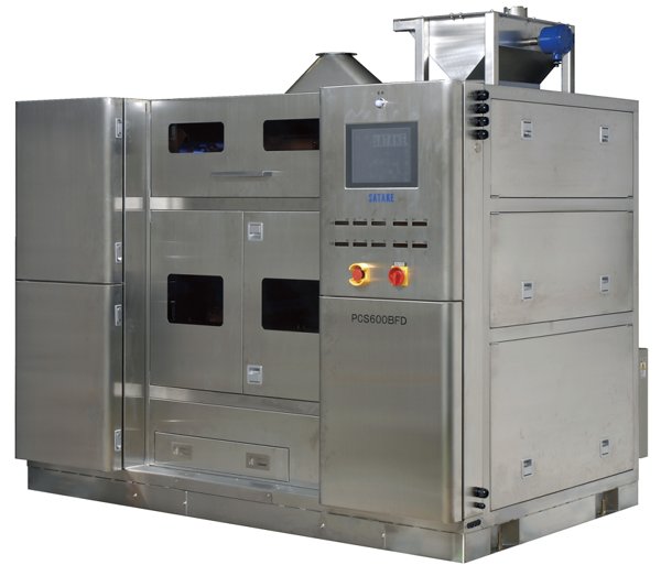 佐竹公司结合多年的色选经验和技术,结合塑料粒子的特点和行业要求,开发出塑料粒子色选机,塑料粒子经过振动喂料器的振动,将物料均匀分布到传动的传送带上,塑料粒子在离开传送带时,高分辨率的相机对每一个粒子进行检查,从相机内传输的信号经过放大器放大和处理来识别出带有黑点的粒子或异色的粒子,后续的喷射阀收到信号后吹出不良品。