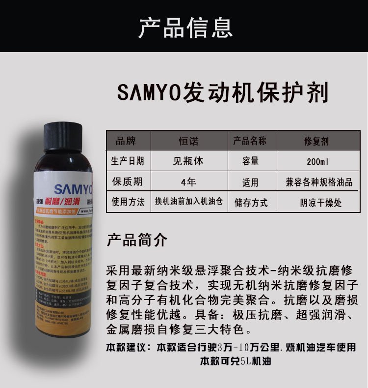 烟台恒诺新材料有限公司>SAMYO石墨烯发动机修复剂强力治烧机油发动机养护剂发动机降噪200ml