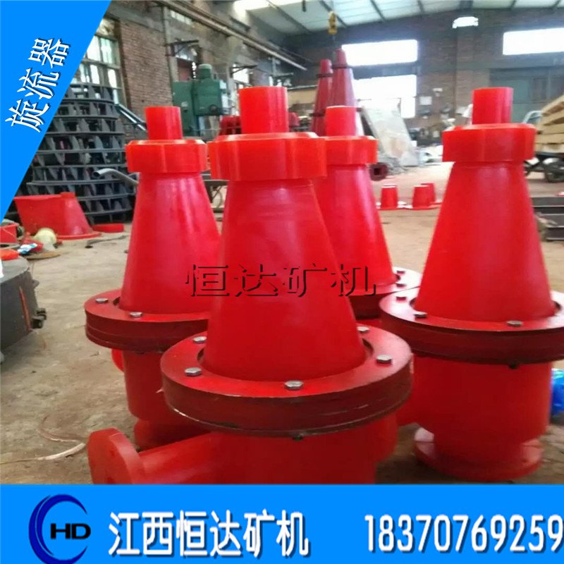 二,产品结构和工作原理水力旋流器的构造:旋流器上部是圆筒 ,筒体上装有与筒壁呈切线方向的给矿管, 筒体中心有溢流管;下部是一个与圆筒相连的倒置圆锥体, 锥体的锥角在15°~60°之间, 锥体下端装有沉砂口,各部分之间均用法兰盘及螺栓连接,以便于更换。 当矿浆以一定的压力(0.5-2.5kgf/cm2)和流速(5-12m/s)从给矿管按切线方向进入圆柱形筒体,随即绕轴线高速旋转,产生很大的离心力。矿浆中粒度和密度不同的颗粒,由于受到的离心力不同,所以他们在旋流器中的运动速度,加速度也各不相同,粗而重的颗粒被抛向筒壁,按螺旋线轨迹下旋到底部,作为沉砂从沉砂口排出。细而轻的颗粒被带到中心,在锥形筒体中心形成螺旋矿流向上运动。