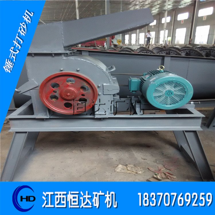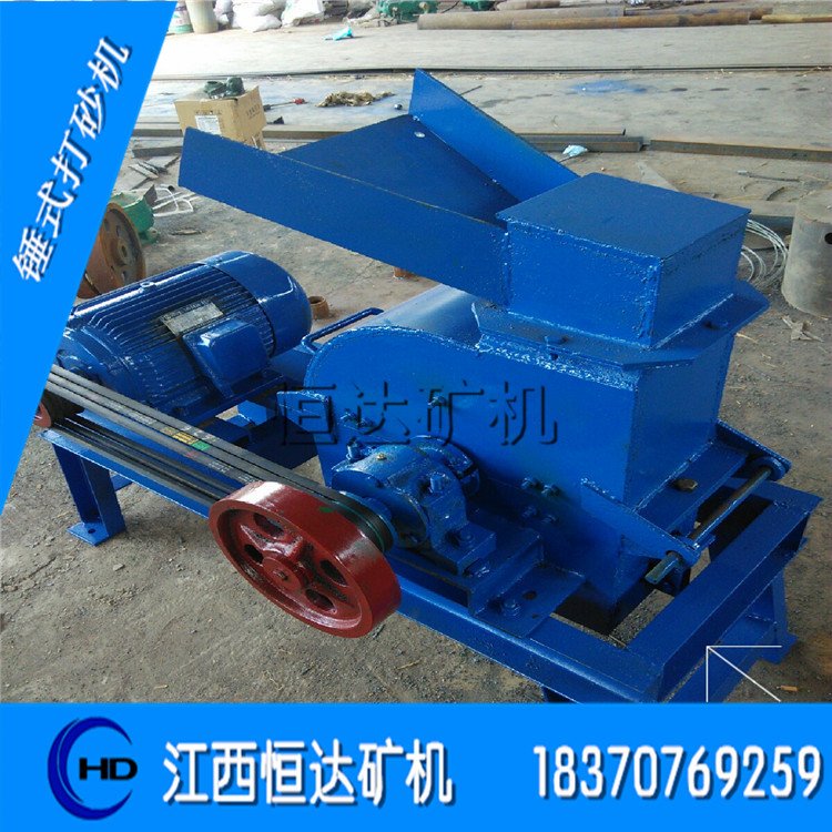 锤式打砂机 锤式打砂机(粉碎)机是打碎矿石的选矿设备之一。它能将50毫米以下的矿石或分离不完全矿物中的尾矿、中矿进行打碎,把有用金属从矿石中分离出来,根据选矿厂要求将矿粒粉碎在1~180目左右,然后进入摇床进行分选。它适用于小型矿厂,在一定程度上替代球磨机。易安装,易操作,投入少,见效快。在实际破碎矿石中可以选用不同规格的筛网,筛孔*小为2毫米。