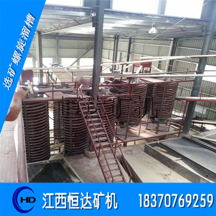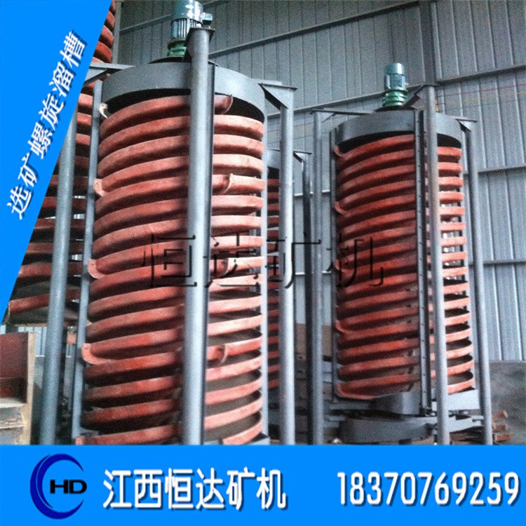 螺旋分选机介绍:螺旋分选机适用于分选粒度0.3--0.02毫米细料的铁矿、钛铁矿、铬铁矿、硫铁矿、锆英石、金红石、独居石、磷乙矿、钨矿、锡矿、钽矿、铌矿以及具有比重差异的其他有金属、稀有金属和非金属矿物体。本设备具有选别过程稳定、容易控制,给矿浓度允许变化范围大,富集比高、回收率高,占地面积小、耗水量少,结构简单,无需动力,处理量大,安装简易,操作方便,投资小见效快等优点。螺旋溜槽技术参数:一、概述玻璃钢螺旋分选机具有国内**的高效重选新设备。用于选别粒度0.3-0.02毫米细粒的铁、锡、钨、钽、铌、金矿、煤矿、独居石、金红石、锆英石以及具有足够比重差的其它金属、非金属矿物,经冶金部组织有关科研,设计、高校和厂矿等单位进行鉴定通过,认为该设备性能优良,选别指标先进,确定成批生产使用。本设备现已在有、黑金属矿山大量应用,并获得冶金部科技研究成果奖。本公司采用**设计图纸和成套技术组织生产,严格质检,保证产品各项技术要求。制造系列化各种规格玻璃钢螺旋溜槽,供有、黑金属矿山,煤炭化工选煤,选硫厂以及科研、设计、院校试验室选用二、螺旋分选机结构玻璃钢螺旋分选机由给矿匀分器、给矿槽、螺旋槽,产品截取槽、产品集聚斗和槽支架(包括十字架或三角架)等六部分组成。由螺旋片联接成的螺旋槽是主要部件。螺旋片是由玻璃钢(玻璃纤维增强塑料)制成,借螺栓接在一起,螺旋槽的选别面有一层预制低磨层。它具有质轻、坚固、经久耐用消费品的优点。螺旋槽的上方设有多管给矿匀分器分矿均匀,控制简便。分矿器自由放置在支桌的十字架(或三角架)上。均分的矿浆通过装在螺旋槽首端的给矿槽缓慢地给到螺旋槽面上,进行分选。螺旋槽的尾端装在有阀块式新产品截取槽将分选的新产品沿径向按品位分成三种(或四种)新产品。用调节阀块的位置来改变各新产品的截取宽度。新产品集聚斗是一同心环形筒,将已截取的多头矿流分别汇集导出。螺旋溜槽的横截面,曲线的斜率变化特别适于细微粒物料的选别。螺旋溜槽具有结构简单、无运动件、重量轻、元噪音、配置安装和方便等优点。