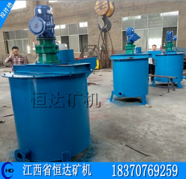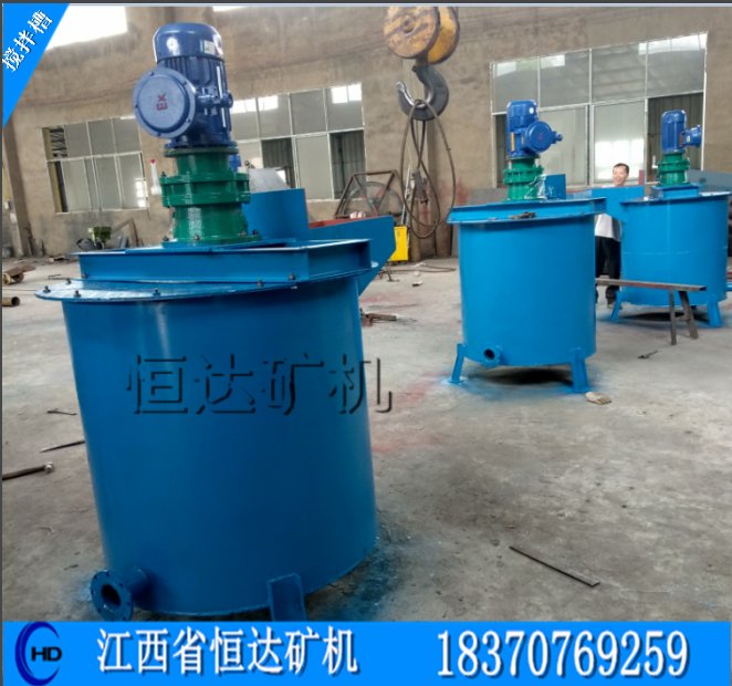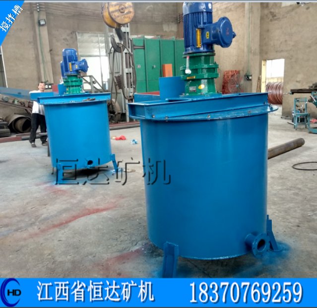 一、用途:搅拌槽适用于各种金属矿,主要用于浮选前的搅拌,是药剂与矿浆充分混合,也可用于其他非金属矿物的搅拌。它使用于浓度不大于30%(按重量计算)固定成分的粒度小于1mm.它的形式是平底桶形辐射循环螺旋叶轮机械搅拌式。用于浮选作业前的矿浆搅拌,使矿粒悬浮时间长与药剂充分接触、混匀溶合。为选别作业创造条件。二、结构:1—给矿管;2—桶(槽)体;3—循环筒;4—传动轴;5—横梁;6—电动机;7—电动机支架;8—溢流口;9—粗砂管