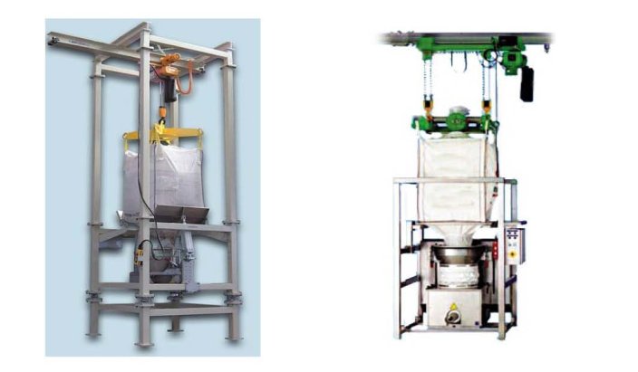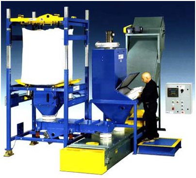 大袋拆包卸料机将吨袋包装物料提升到进料口,人工将包装袋的袋下料口解开后,打开流量控制阀和附带的振动下料装置促使包装袋内的粉粒状物通过自重落到下方的料斗中。
