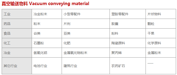 · 制药行业的原料药、粉状物料、颗粒物料、混合物料(输送过程不会产生分层现象)、药片、胞衣药丸、胶囊等;