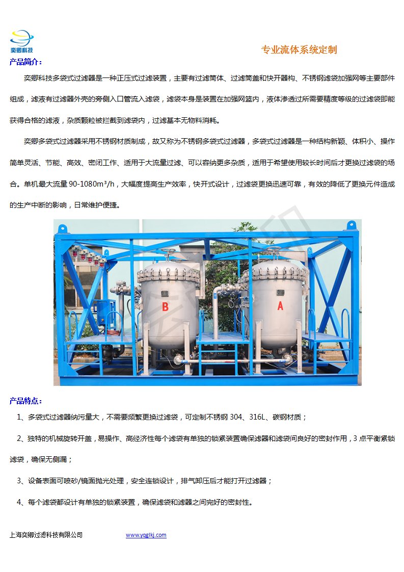 奕卿多袋式过滤器采用不锈钢材质制成,故又称为不锈钢多袋式过滤器,多袋式过滤器是一种结构新颖、体积小、操作简单灵活、节能、高效、密闭工作、适用于大流量过滤、可以容纳更多杂质,适用于希望使用较长时间后才更换过滤袋的场合。单机**流量90-1080m³/h,大幅度提高生产效率,快开式设计,过滤袋更换迅速可靠,有效的降低了更换元件造成的生产中断的影响,日常维护便捷。