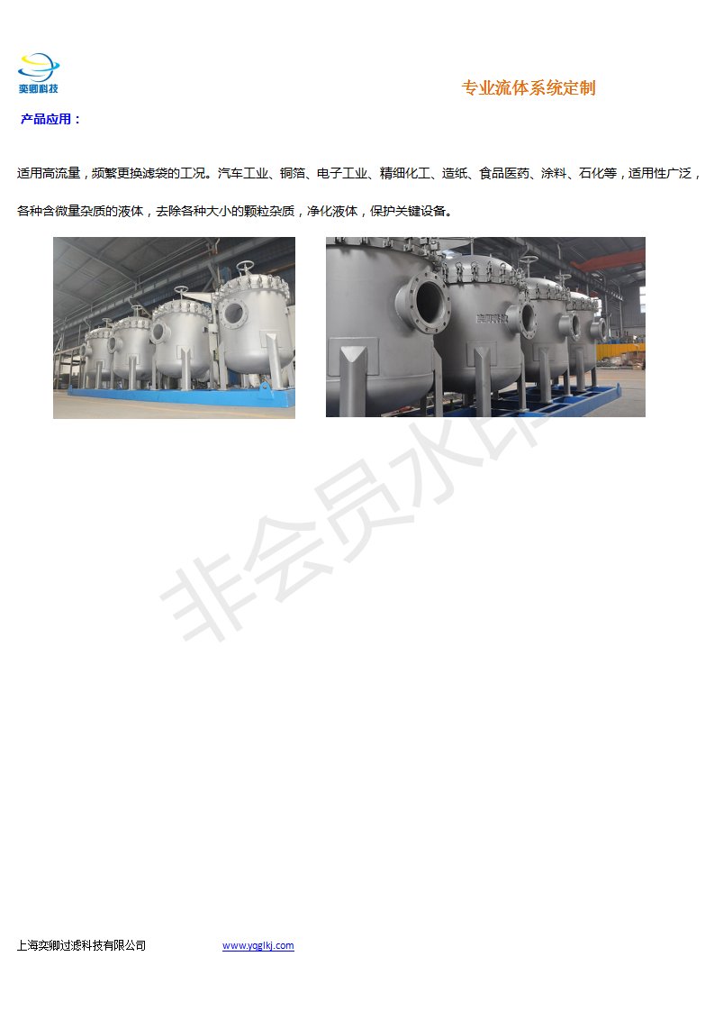 适用高流量,频繁更换滤袋的工况。汽车工业、铜箔、电子工业、精细化工、造纸、食品医药、涂料、石化等,适用性广泛,各种含微量杂质的液体,去除各种大小的颗粒杂质,净化液体,保护关键设备。