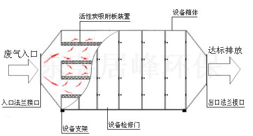 废气经过吸附塔内的初效过滤器除去固体颗粒物后,进入塔体,经过活性炭层吸附后,除去气体中的有机废气分子,达到符合排放标准的净化气体,经风机排到室外。