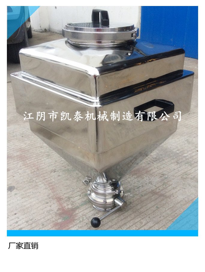 方锥形混合筒、左右支架、传动系统及电器控制系统,混合筒在展开板开料前首先对板材进行镜面加工,加工后贴上保护膜,待筒体拼接后,焊缝处再进行人工抛光至镜面,筒体与轴套焊接时将轴套固定在专用焊接架上,然后把筒体按到规定位置进行焊接,焊接后取下筒体让其时效消除焊接处应力,再上鏜床加工两端轴套至装配尺寸,该加工工艺能有效的保证两轴套的同轴度,使混合机在运转过程上平衡性好,噪音低(噪音不超过70DB(A)),使用寿命长,支架采用分体式钢结构组装而成,外包不锈钢面板,传动部采用普通电机带动蜗杆减速器,有减速器带动齿轮再带动混合筒运转,该传动系统可正反转,并有自锁作用,可使混合筒任意位置停顿,这样有利于卸料彻底、清洁方便。上料系统采用真空上料系统并带快装卸式接头,下料口采用蝶阀控制。电器控制采用按键式,并设有定时、点动、正反转按钮