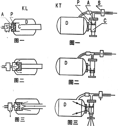 3、启动电磁阀或气动控制阀,S换向,A中余气经S排出,A、D压力失去平衡,P受D压力作用很快回移,同时D中的压缩空气通过喷射管在几微秒之内喷射出去。(图三)