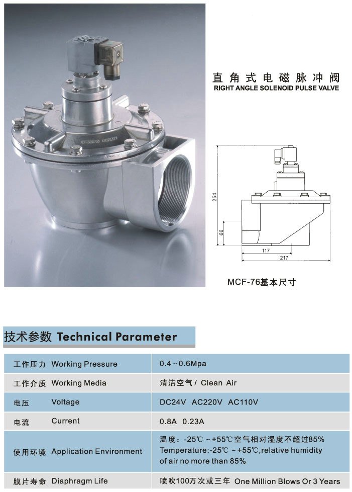 脉冲电磁阀,电磁脉冲阀(亦称隔膜阀)是脉冲袋式除尘式除尘器青灰喷吹系统的压缩空气“开关”。受脉冲喷吹控制仪输出信号的控制,对滤袋诼排喷吹青灰,使除尘器阴力保持在设定的范围之内,以保证除尘器的处理能力和叫尘效率。DMF-Z型电磁脉冲阀为直角型阀,其进出口之间的夹角为90°,它适合于隼气筒与除尘器喷吹管的安装连接。气流畅通,能提供符合要求的青灰气脉中。