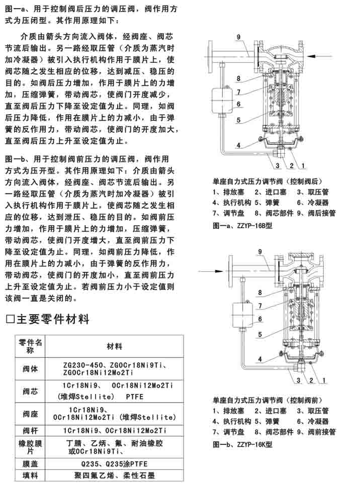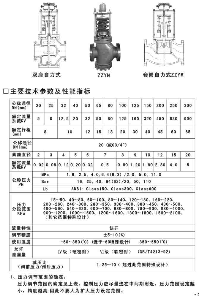 ZZY自力式压力调节阀_(自力式,压力)调节阀无需外加能源,利用被调介质自身能量为动力源,引入执行机构控制阀芯位置,改变两端的压差和流量,使阀前(或阀后)压力稳定。具有动作灵敏,密封性好,压力设定点波动小等优点,广泛应用于气体、液体及蒸汽介质减压稳压或泄压和稳压的自动控制。本系列产品有单座(ZZYP),套筒(ZZYM),双座(ZZYN)三种结构;执行机构有薄膜式、活塞式二种;作用形式有减压用阀后压力调节(B型)和泄压用阀前压力调节(K型)。