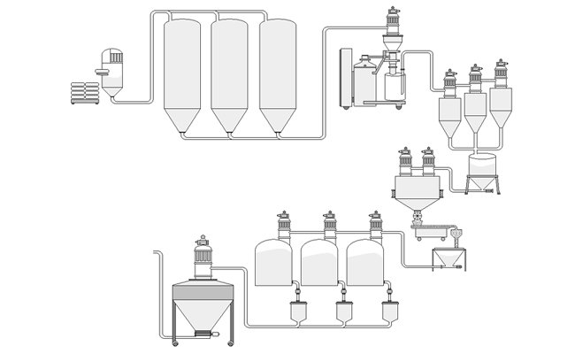 Glove-box discharging system would be the best choice referring to powder with low accumulation density and harmfulness to human body and environment.