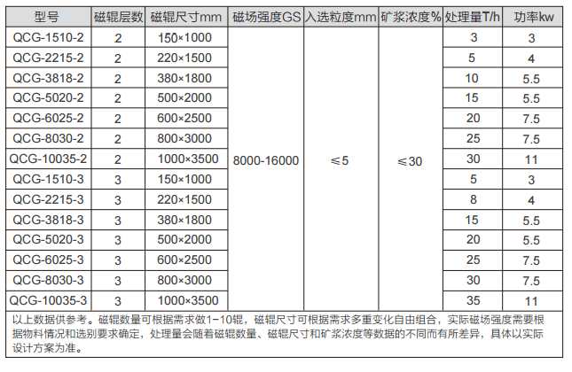 一、说明QCG型湿法辊式磁分离机是我公司根据多年经验和客户现场需求研发的一种组合机型,可以实现多重结构或不同磁场强度的组合。其原理为物料经料仓通过导料盘进入磁场区,磁性矿物被吸附在磁辊表面旋转到达精矿区,毛刷将吸附在磁辊表面上的磁性矿刷脱,在高压水的喷射下落到精矿斗里,部分未被吸附的磁性矿粒、非磁性矿粒和磁性较弱的矿粒进入到下一级再选,*多个实现10辊组合,可对物料进行多达10次的分选,特别是对强磁性、中磁性、弱磁性共存矿物有显著的分选效果。