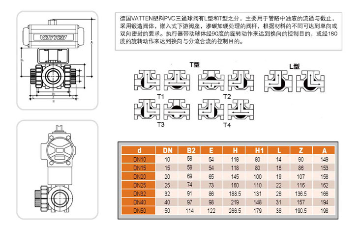UPVC气动三通球阀重量轻、耐腐蚀性强,被应用于多个领域,如一般纯水和生饮水的管路系统、排水和污水管路系统、盐水和海水管路系统、酸碱和化学溶液系统等多个行业,品质得到广大用户的认可。【阀体材质】:UPVC、CPVC、PPH【阀板材质】:UPVC、CPVC、PPH【密封阀座】:PTFE【压力等级】:1.0MPa【公称通径】:DN40-DN300【结构形式】:三通L型、三通T型【连接方式】:双由令活接式【电压范围】:AC220V/110V/380V/24V 50/60HZ DC24V/12V +10%到-10%【电动执行器】:双作用、单作用