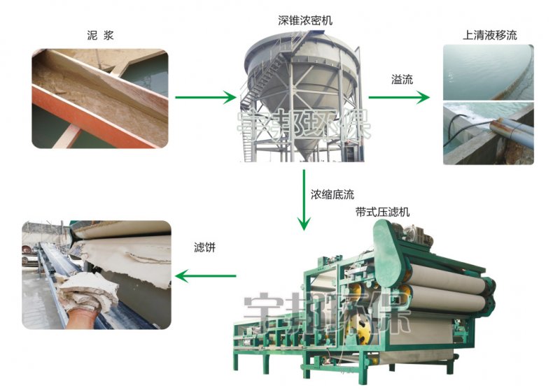 工艺流程: 砂石厂泥浆 -> 泥浆收集池 -> 浓缩沉淀池 -> 带式压滤机 -> 干泥饼 及(滤液) -> 制砖