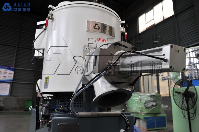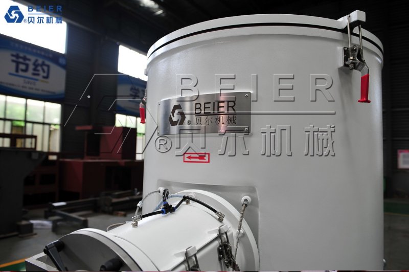 锅体混合料出口置于锅底面,利于混料机快速有效排料,锅底的弧度设计避免了混合料的大量滞留,出口堵头采用圆弧面加工技术,精确地按锅底弧度形状闭合在锅底。排料口堵头沿轴向直线柱塞式动作。