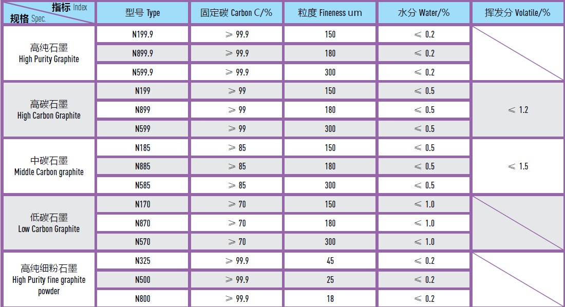 鳞片石墨按含碳量的高低分类: 如含碳量≥ 99.9% 为高纯石墨;含碳量在94-99.9% 之间为高碳石墨;含碳量在80-94% 为中碳石墨;含碳量在50-80% 之间为低碳石墨。