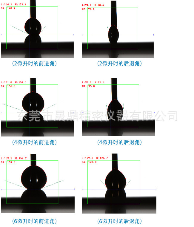 测量样品前进后退角并取其滞后角,测量方式:插针法;测量方法:微分椭圆法、微分圆(大于120°的角度学界定义要用Young-Lapalacer,但原方法无法拟合不规则,不水平,不清晰的超疏水液体图片,微分椭圆法是我司在Young-Lapalacer的基础上做的升级,弥补了杨氏方程式上述几点欠缺)。