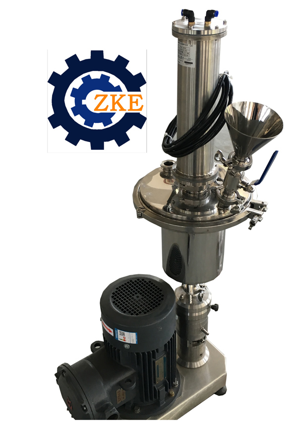 ZKE德国超细混悬液乳化机由电动机通过皮带传动带动转齿(或称为转子)与相配的定齿(或称为定子)作相对的高速旋转,被加工物料通过本身的重量或外部压力(可由泵产生)加压产生向下的螺旋冲击力,透过乳化机定、转齿之间的间隙(间隙可调)时受到强大的剪切力、摩擦力、高频振动等物理作用,使物料被有效地乳化、分散和粉碎,达到物料超细粉碎及乳化的效果。