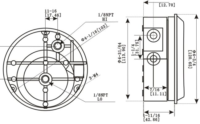 ●连接件:相同的1/8" NPT的高压和低压接头,一对在侧面,一对在背面