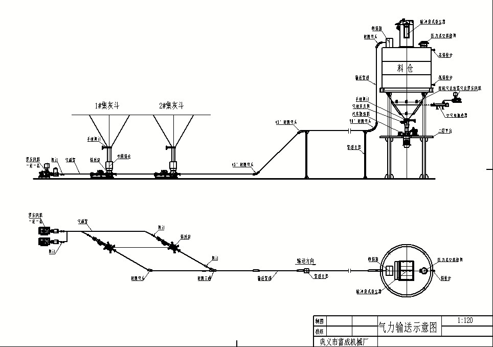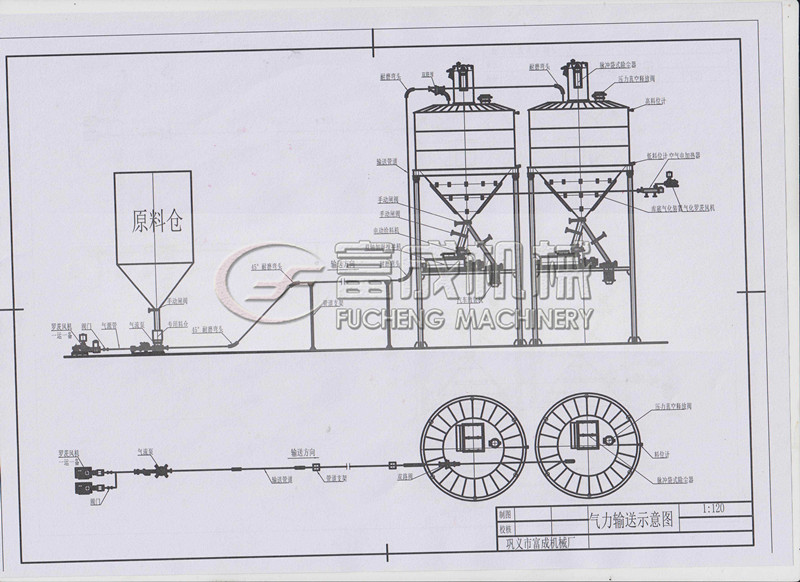 气力输送设备的原理: 该装置是利用压缩空气作动力, 将固态颗粒物通过密封管道进行干法输送的全套系统设备。 该系统一般包括气源、 发送器、 管道、