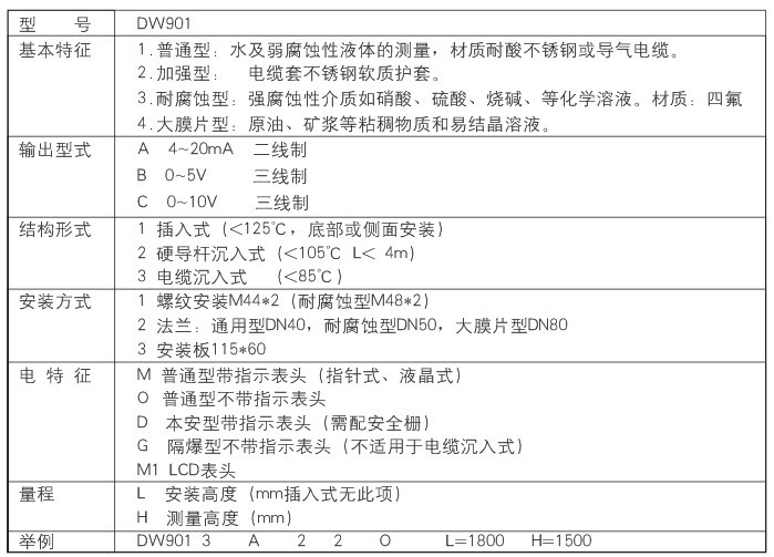 DW901系列静压式液位变送器由测量探头、接线盒和固定连接件三部分组成。采用投入式压力传感器探头沉入容器底部测量液位高度,液体静压力用公式P=Po+ρgh表示。其中Po为液面上部大气压,ρ为被测液体密度,H为液柱高度,g为重力加速度(常数)。为了消除液面上部大气压的影响,DW901变送器采用通心透气电缆设计方案,将PO导入传感器感压面背部,以抵消Po的影响。可见,传感器检测到的压力P与被测液位成线性关系。压力信号由单片集成V/I变送器转换成4~20mA DC输出信号,测量(记录)输出电流值大小,就可以测定液位的高度。当输出电流达到所设定的电流值时,通过选购件控制器,即可发出控制或报警信号。