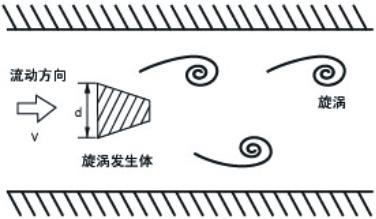 涡街流量计是利用卡门涡街原理进行流量测量的。在测量管中垂直插入一个柱状物时,流体通过柱状物两侧就自然交替地产生有规则的旋涡(如下图所示),这种旋涡列被称为卡门涡街在d/D=0.281时,释放的旋涡*稳定。(D为管道直径。)卡门涡街的释放频率与流体的流动速度及柱状物的宽度有关,可用下式表示:
