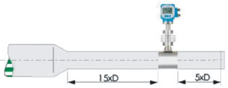 若传感器安装点的上游有大于>15°渐缩管,则:上游直管段≥15D,下游直管段≥5D
