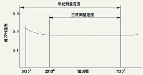 斯特罗哈数是涡街流量计的重要系数,在一定的雷诺数范围内,斯特罗哈数接近常数。如下图所示,在曲线的St=0.17平直部分,旋涡释放频率与流速成正比,检出频率f就可求得流速v,由v求出体积流量。