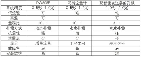 标准节流装置都是严格按IS05167-2003和GB/T2624-2006加工制造。但此制造过程中只能依靠用户提供的假定的工况参数来设计。而实际的现场工况往往与设计参数有很大出入,甚至现场工况随着工艺的改变经常也会更改,因此工作在现场的蒸汽流量计系统如果不能将实时更改的参数进行补偿重新计算,是不可能胜任蒸汽流量计的。目前大多数的蒸汽流量计虽然对蒸汽的密度进行了温度与压力的补偿,但工作在现场的蒸汽流量计自身的节流装置也会随温度与压力的改变而改变性能,因此对流出系数C与可膨胀性系数进行全方位补偿的蒸汽流量计才能算是真正的动态补偿流量计。下面列出目前市场上常用的蒸汽流量计的性能对比表。