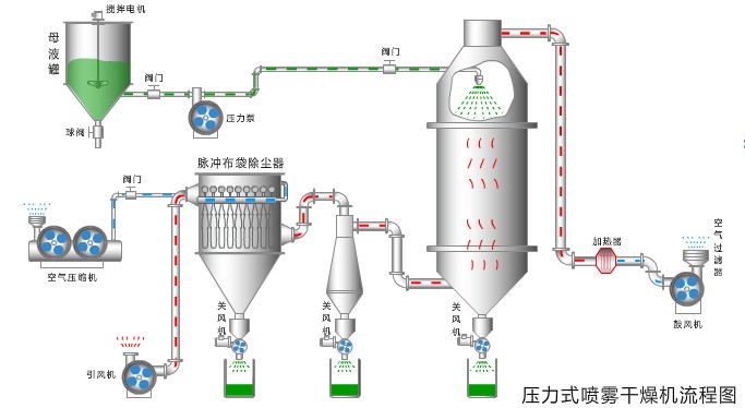 本机组工作过程为料液通过隔膜泵高压输入,喷出雾状液滴,然后同热空气并流下降,大部份粉粒由塔底排料口收集,废气及其微小粉末经过旋风分离器分离,废气由抽风机排出,粉末由设在旋风分离器下端的授粉筒收集,风机出口处还可装备二级除尘装置回收。