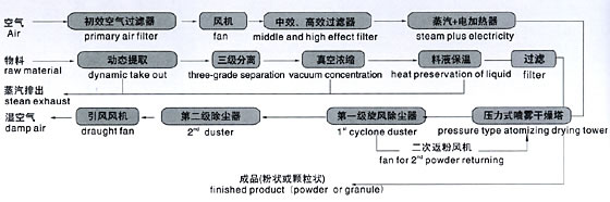 概述: 该机采用全封闭形式,所有部件均采用不锈钢制造,配有三级净化装置,过滤后的空气达十万级要求,物料经过处装有自动清洗装置。它属于垂直下降并流型压力式喷雾干燥机,这种形式的塔壁无粘壁现象,具有广泛的适用性,通过调整高压供料泵的动力,使雾化压力可达1-20Mpa,能满足含固率为20-30%中药浸膏的干燥,成品的平均粒径可达40-120目,粒径大的可以免去制粒工序,实现一步法干燥制粒,还可通过二次返粉造粒,提高粒径,减少成品中的含粉率,颗粒均匀一致,成品堆积密度小、分散性、流动性、溶解性好,适宜制成中药冲剂、粉剂、胶囊等中成药的原料药或复方制剂。 基本原理: 广谱高压力喷雾干燥装置是压力式喷雾干燥技术在特定物料干燥中的应用,也是应用高压泵把物料送至喷嘴,使物料分散成雾状,与平行束状热风充分接触,完成瞬间干燥,形成粉状或颗粒状成品的干燥装置。 广谱高压力喷雾干燥装置与普通压力式喷嘴雾干燥装置的区别在于:解决了空气的初、中、高效三极过滤,热风温度低,风量大,有效地防止中药成份受热挥发和分解,被干燥物料瞬间快速固化、不粘壁,集低、中、高压力式喷雾于一体,并解决了塔体,管路清晰等关键技术。 设备特点: ● 塔体上装有自动振打装置; ● 塔体、管路具有快开清洗孔及排污孔; ● 自动控制恒温加料罐; ● 物料过滤器; ● 手工高压洗塔随机附件; ● 与物料接触的部分采用不锈钢材料制作; ● 物料收集采用两级旋风除尘器(标准旋风除尘器,扩散旋风除尘器)或一级旋风除尘器、一级湿式除尘器; ● 进风温度实现自动控制 GYPG 型广谱高压力喷雾干燥机工艺流程图