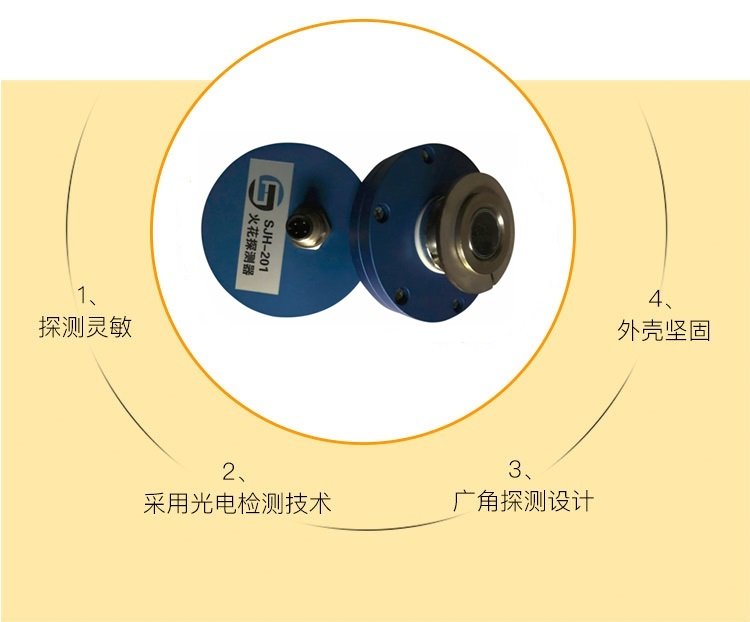 砂光机火花探测器(管道火花报警系统)用于探测粉尘输送管道中夹杂的火星或火花,利用红外线高敏感探测器探测火花,及时报警,并启动下游的喷淋装置及时熄灭火花,达到保护设备,防止发生着火或爆炸的目的,整个过程在少于0.1秒内完成。安装简单方便。