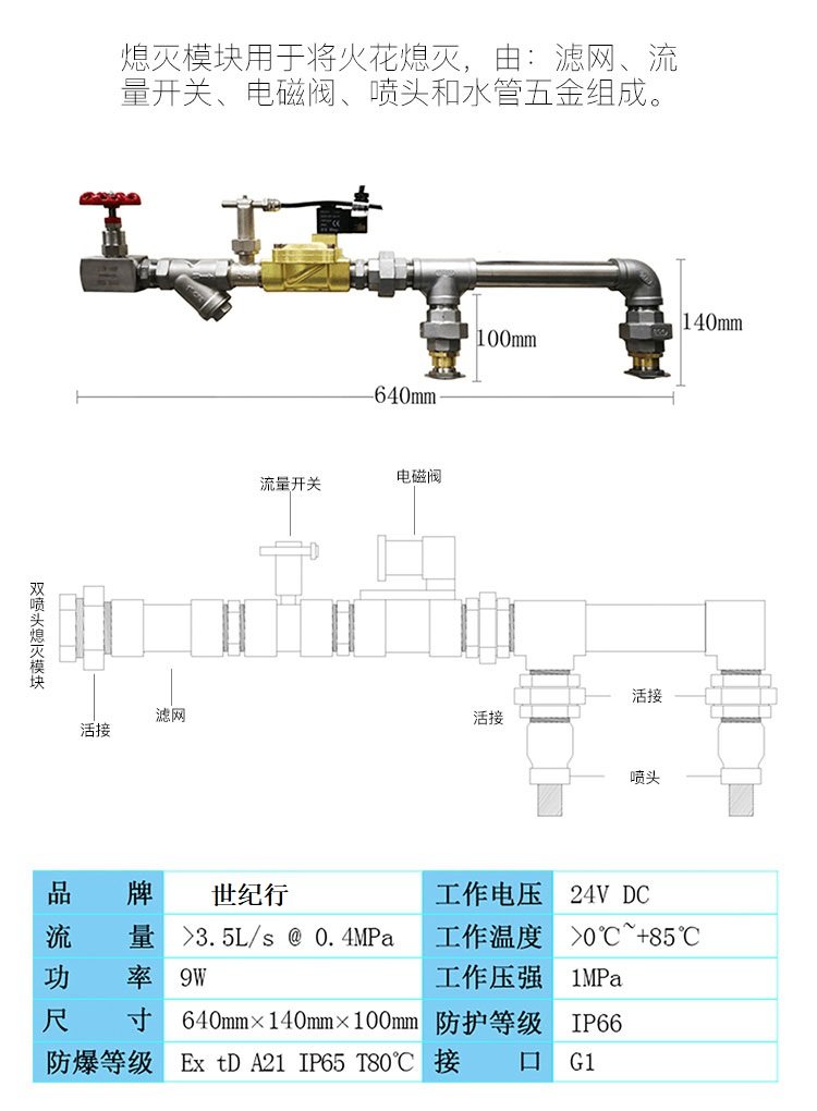 技术参数:1.反应时间 :<0.1秒2.输出 :特定频率信号3.工作温度 :80度~+800度4.工作电压 :5~36VDC5.工作电流 :<10MADC 6.防护等级 :IP65 7.防爆等级 :EXTDA21IP65T80 8.材质 :T6061航空铝+304不锈钢 配置:三个探测+控制+报警+熄灭+联动 功能:安装于除尘系统管道,用于探测报警,熄灭和联动停风机。 用途: 木业,板业,塑化,家具行业车间,切割,开料,砂光等环节生产过程中央吸尘管道适用。