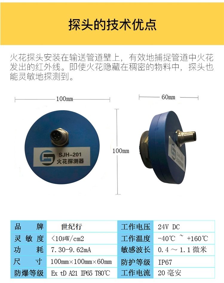 1、 探测灵敏。在研究各类火花的特征光谱曲线的基础上,选择对应的高速光敏原件,匹配探测波长范围。探头能够探测到*小的火花和炽热颗粒,具有高度的灵敏性;同时,探测系统能够穿过高密度的物料、尘埃进行探测。