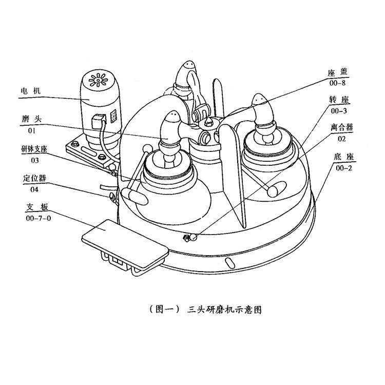三头研磨机结构主要由三套磨头、离盒器、研钵支座、及定位器等总装组成。