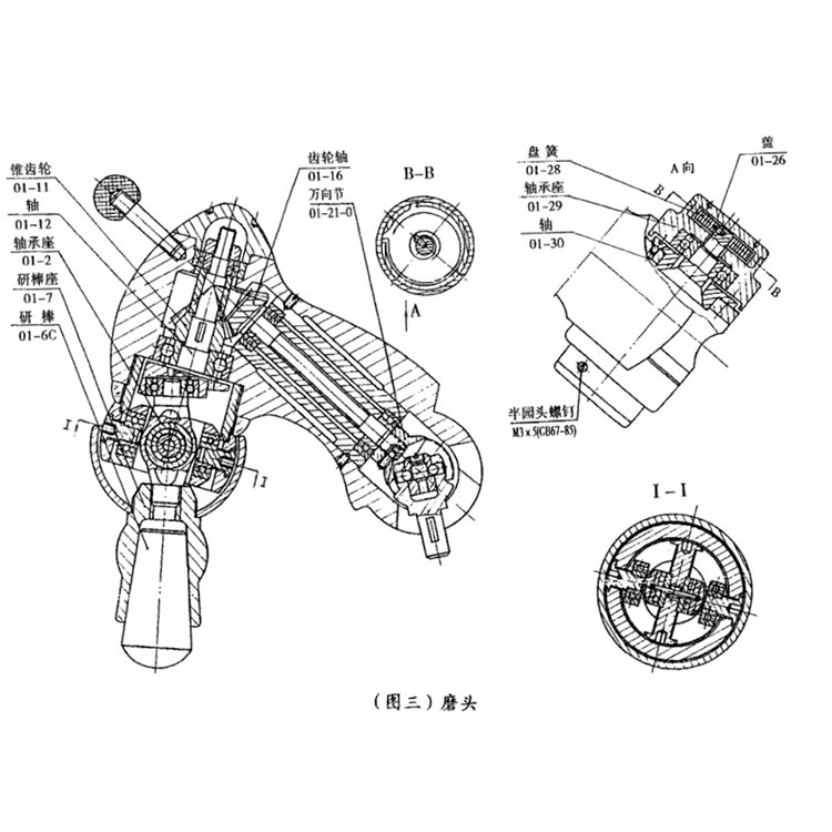 磨头结构见,当动力由离合器万向节传来时,由锥齿轮轴,锥齿轮带动轴旋转,由于偏心作用,轴带动轴承座及其上的研棒座,研棒绕轴作旋转运动。