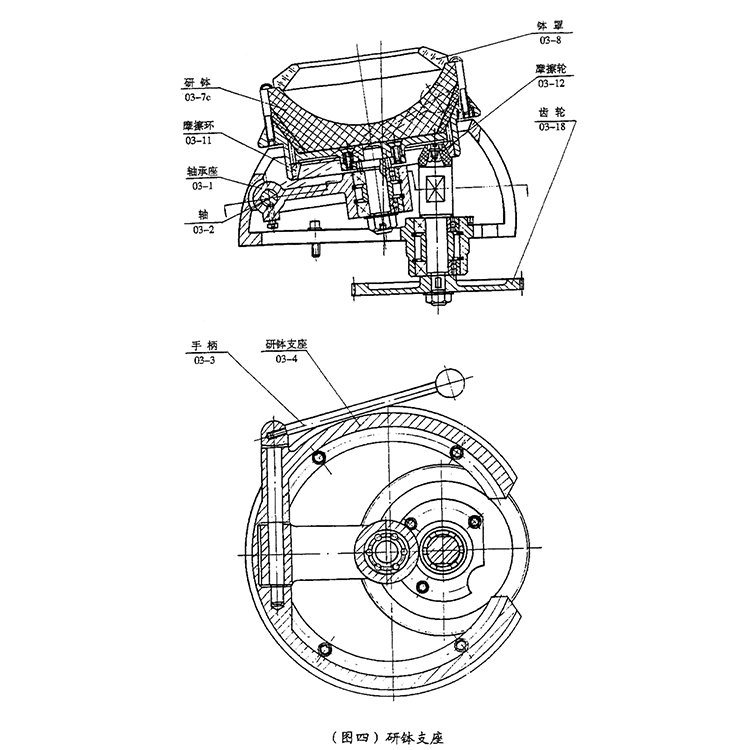 研钵支座的结构,当动力由齿轮传来时,摩擦轮带动摩擦环,从而使研钵旋转。另外轴承座通过轴铰接于研钵支座横孔中,当抬起磨头,取下钵罩,操纵手柄,则研钵随同轴承座绕轴旋转,以便倒也已磨好的物料。