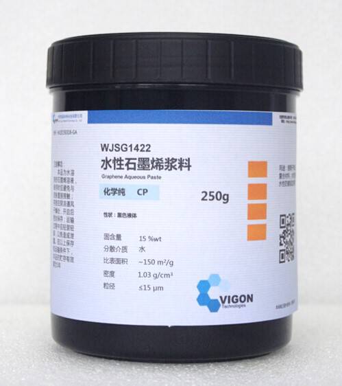 水性石墨烯浆料 (WJSG1422):以高质量石墨烯粉体为核心、去离子水为溶剂的石墨烯浆料,将石墨烯粉体均匀分散在基体材料中,以满足石墨烯粉体使用中对分散性的要求。可对本产品进行共价键和非共价键功能化,在提高溶解性的同时,还可以赋予其新的性能。因此本产品可广泛应用于各种石墨烯类材料的制备。可以按照客户的特殊要求进行初步加工。