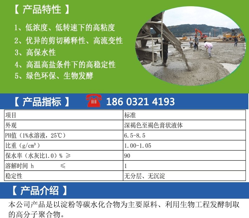 本公司产品是以淀粉等碳水化合物为主要原料、利用生物工程发酵制取的高分子多糖聚合物。拥有假塑性的流变学改性剂。具有增粘、高减水率、保坍性好、施工性、配伍性、保水性及泵送更好且安全环保等优点。可提高混凝土、砂浆的保水性,避免离析、泌水;改善减水剂的敏感性、改善速凝剂的抗流挂性。适用于特种/湿拌砂浆、海工混凝土、超高泵送大流态、再生混凝土的生产;用于减水剂、速凝剂的复配。