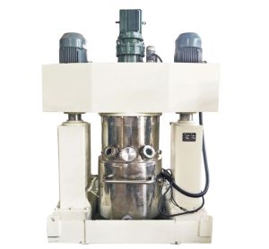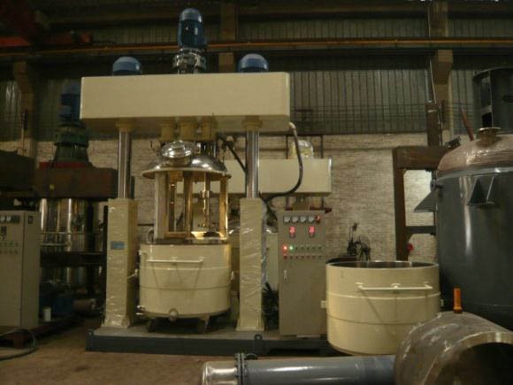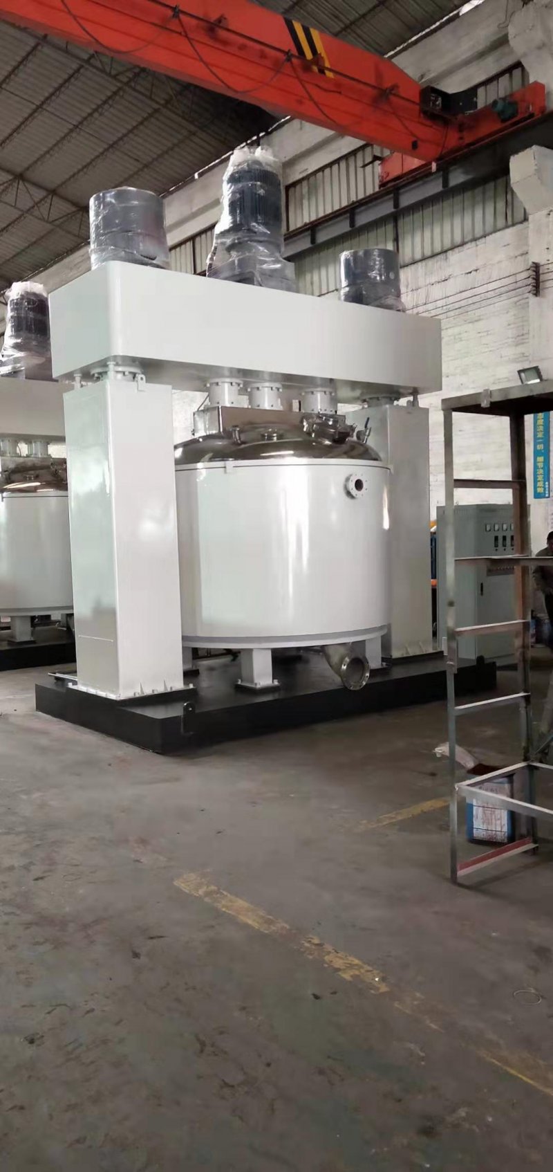 这种混合机可以与各种生产形式同时进行,单速、双速、变速、三种速度可供选择,满足各种工艺要求。强力分散机釜内有三种不同形式的搅拌器,其中一个搅拌器慢速刮壁旋转,其余两面搅拌装置又以不同的转速绕自身轴线高速运转,使物料在釜内作复杂的运动,受到强烈的剪切和搓合。设备内山形刮壁刀绕釜体轴线转动,将粘在壁上和底部的原料刮出参与混合,使其效果更为理想。设备密封性好,可抽真空,具有良好的排气除泡效果。设备釜盖可液压升降。釜体可自由移动,操作十分方便。搅拌器的形式,根据物料要求可为多层浆叶式、框式、蝴蝶式、外轮式等。