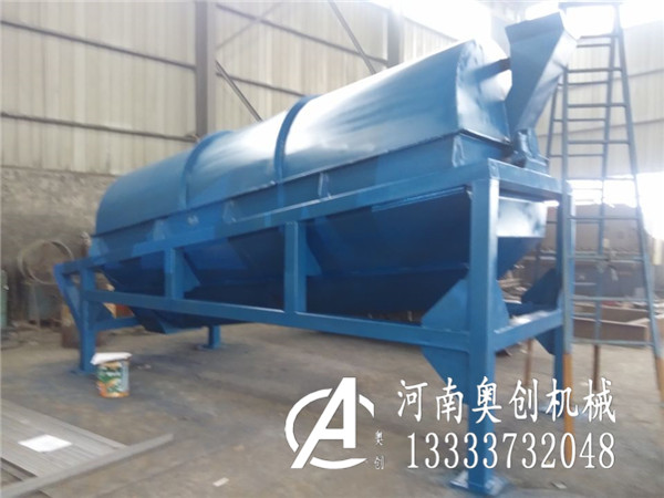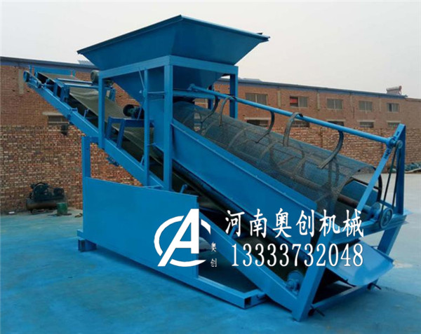 滚筒筛主要有电机、减速机、滚筒装置、机架、密封盖、进出料口组成。滚筒装置倾斜安装于机架上。电动机经减速机与滚筒装置通过联轴器连接在一起,驱动滚筒装置绕其轴线转动。当物料进入滚筒装置后,由于滚筒装置的倾斜与转动,使筛面上的物料翻转与滚动,使合格物料(筛下产品)经滚筒后端底部的出料口排出,不合格的物料(筛上产品)经滚筒尾部的排料口排出。由于物料在滚筒内的翻转、滚动,使卡在筛孔中的物料可被弹出,防止筛孔堵塞。滚筒筛砂机、滚筒筛分机与滚筒筛的原理几乎相同,是人们对它的认识和叫法上存在差异。