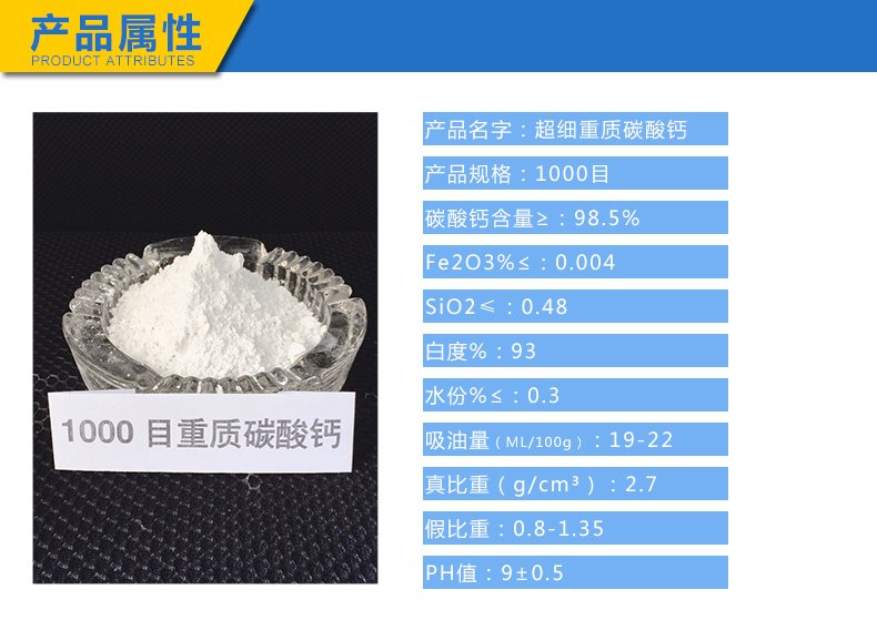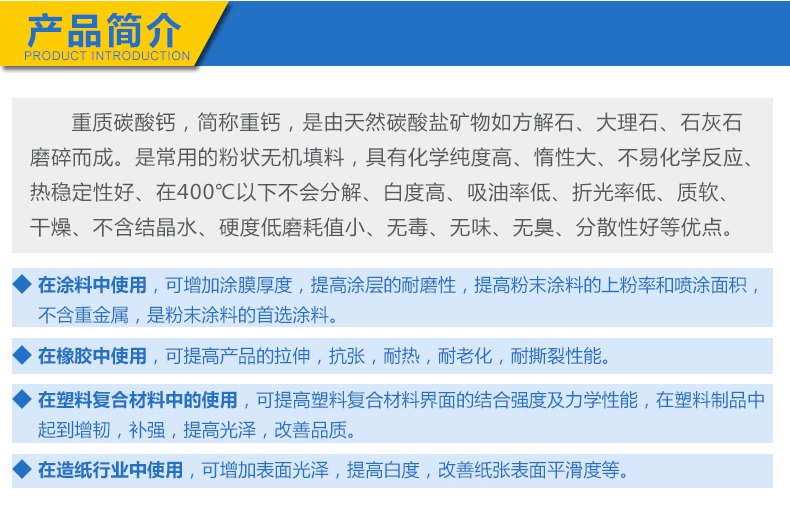 重质碳酸钙,简称重钙,是由天然碳酸盐矿物如方解石、大理石、石灰石磨碎而成。是常用的粉状无机填料,具有化学纯度高、惰性大、不易化学反应、热稳定性好、在400℃以下不会分解、白度高、吸油率低、折光率低、质软、干燥、不含结晶水、硬度低磨耗值小、无毒、无味、无臭、分散性好等优点。
