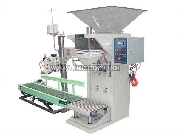 产品内容: 该机是人工协助上袋自动称重、夹袋、充填、振动、推袋,输送袋传递进行自动缝包或封口,