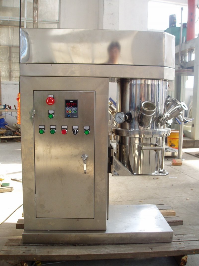 行星搅拌机具有独特、新颖的搅拌形式,釜内有两根或三根搅拌器和一至两个自动刮壁刀,搅拌器在绕扶梯轴线公转的同时,又以不同的转速绕自身轴线自转,使物料在釜内做复杂运动,收到强烈的剪切和搓合。此外,设备内的刮壁刀绕釜体轴线转动,将粘在壁上之物料刮下参与混合,使其效果更为理想。设备釜盖可液压升降,缸体可自由移动,操作十分方便。